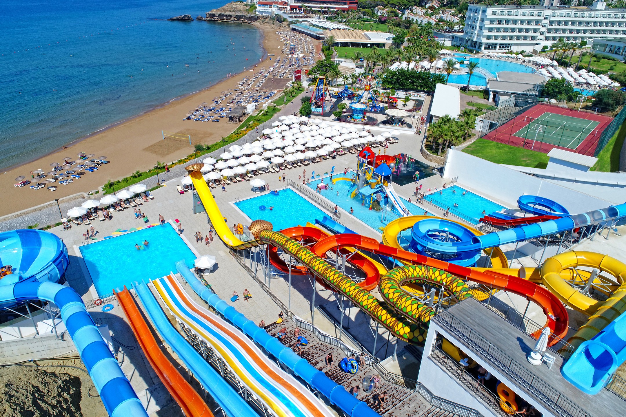 Misafirlerine suyun en eğlenceli halini doyasıya yaşama imkanı sunan tesiste; 2 açık havuz, 5 kayma havuzlu ve 24 kaydıraklı aquapark (10.00-12.00 ve 14.00-17.00 saatleri arasında hizmet veriyor), 17 yaş üzeri için sezonda hizmet veren sonsuzluk havuzu, ısıtmalı kapalı havuz, açık ve kapalı çocuk havuzu bulunuyor.